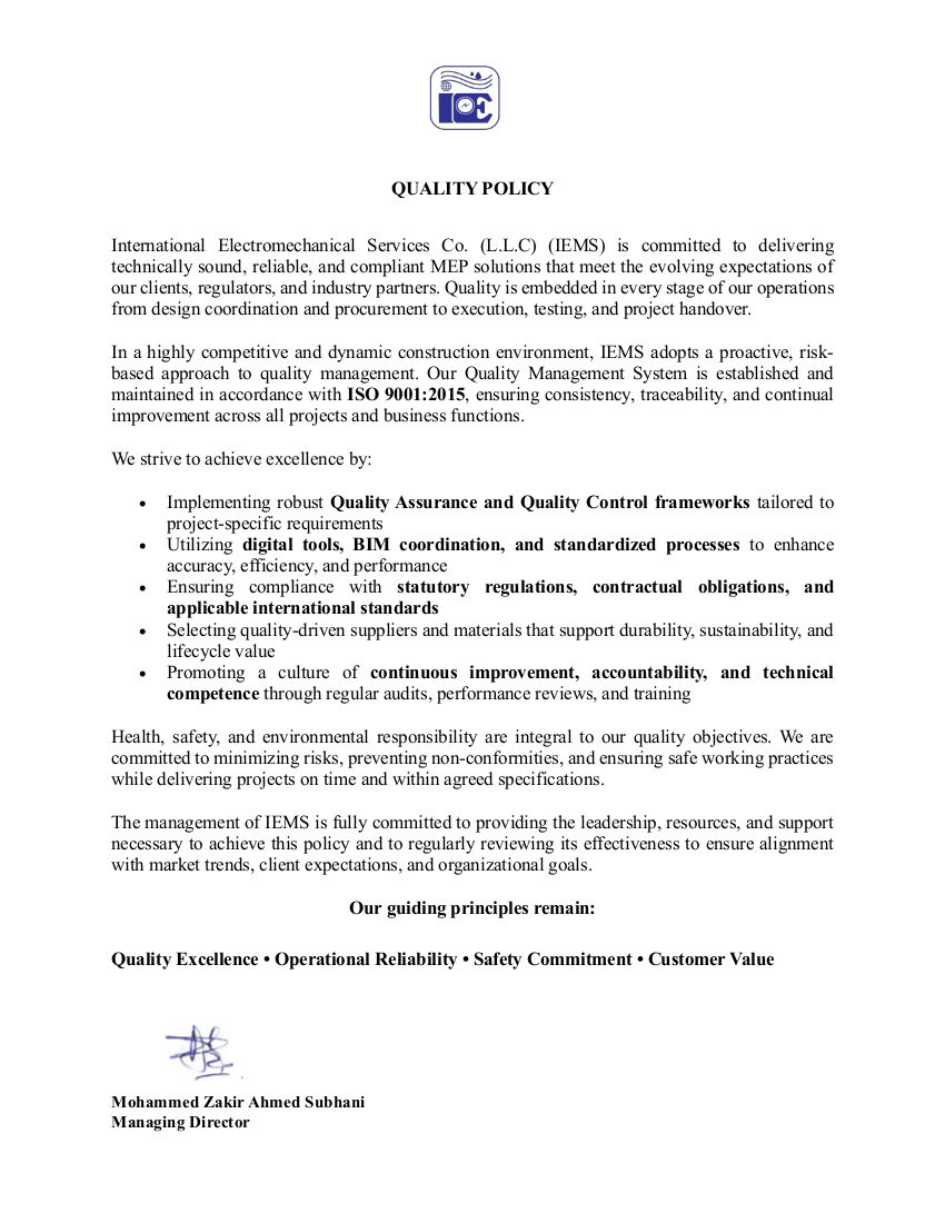 IEMS conducts periodic quality audits to adhere to the established quality management system, both administrative and operational and to work towards continuous improvement which results in our Clients being fully satisfied with the quality of MEP works and services provided.