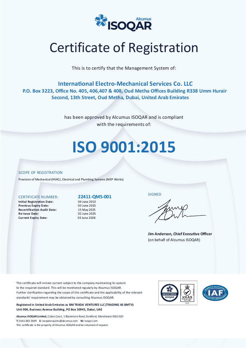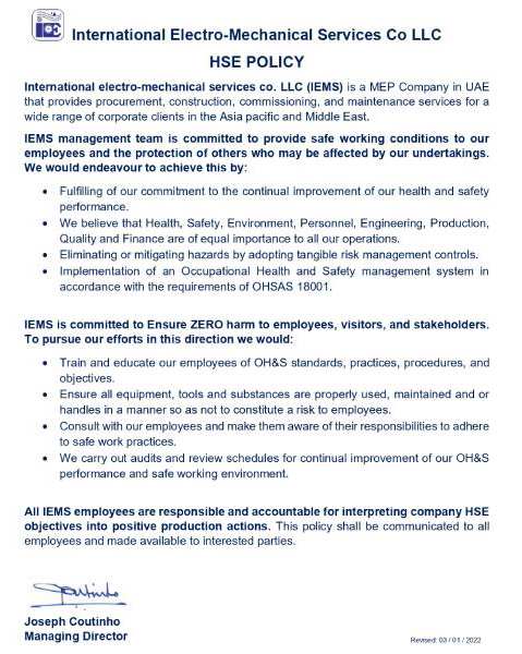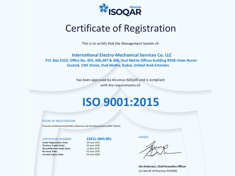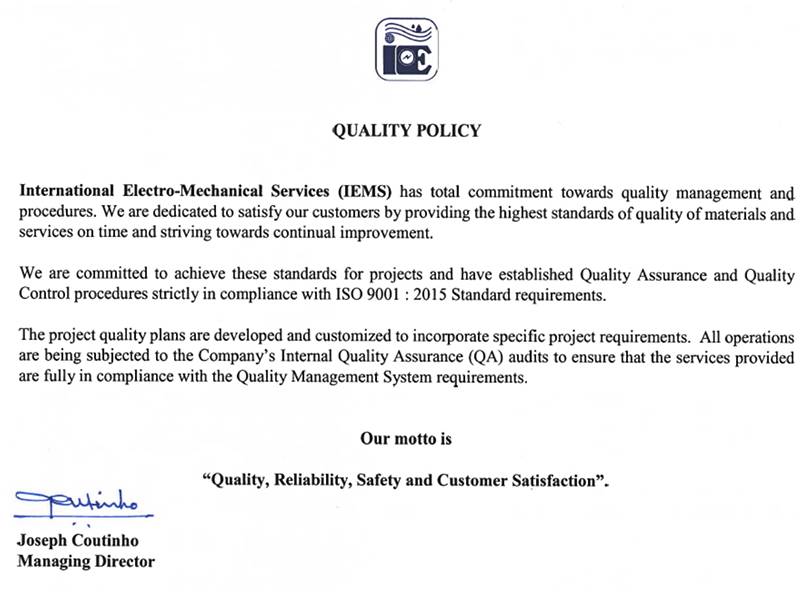 IEMS conducts periodic quality audits to adhere to the established quality management system, both administrative and operational and to work towards continuous improvement which results in our Clients being fully satisfied with the quality of MEP works and services provided.
